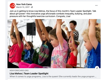 Lisa's work with New York Cares started over a decade ago, long before yoga became the mainstream form of exercise it is today. Since then, Lisa has grown programs such as Yoga at Hudson Guild, by developing curriculum that helps combat inequality, bullying and peer pressure.