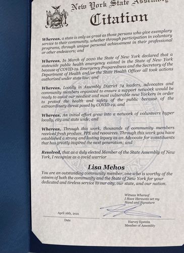 NYS Assembly “Citation” for “exemplary service”, stating: “Through this work you have established a strong and lasting legacy as an Advocate for constituents that has greatly inspired the next generation” and concludes “You are…worthy of the esteem of...community and the State of New York for your dedicated and tireless service to our city, the state, and our nation;”